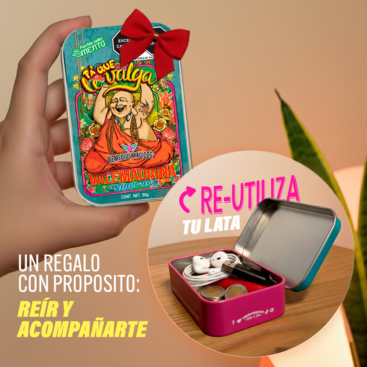 Remedio Lata de 9.5 x 6 x 2 cm, con 50 g. de Dulce comprimido sabor MENTA personalizada. Calidad exportación. Lata con o sin bisagra, con etiqueta full color barnizada y duradera. REUTILIZABLE PARA ORGANIZAR Y GUARDAR una gran variedad de cosas. Ideal para cargar en la bolsa. ¡Apóyanos!, contagia al mundo con tus risas en nuestras redes sociales.